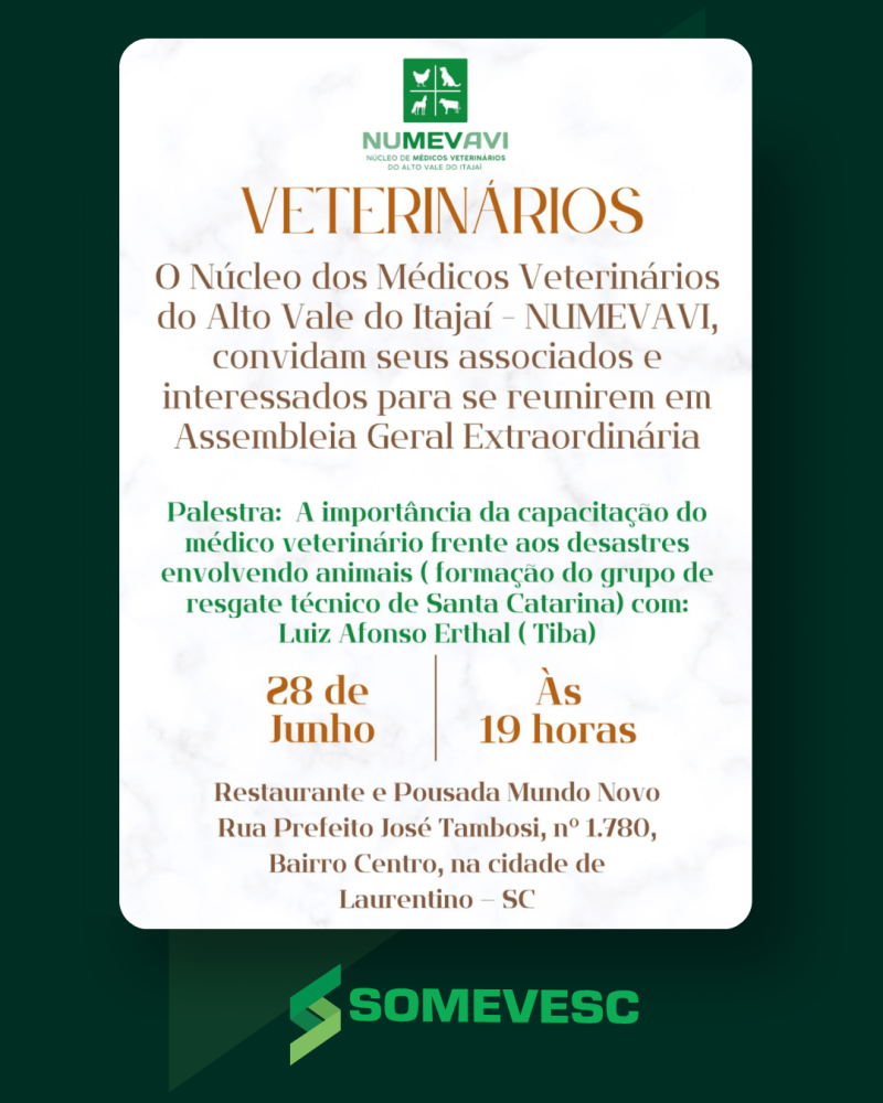 O Núcleo dos Médicos Veterinários do Alto Vale do Itajaí - NUMEVAVI, convidam seus associados e interessados para se reunirem em Assembléia Geral Extraordinária.