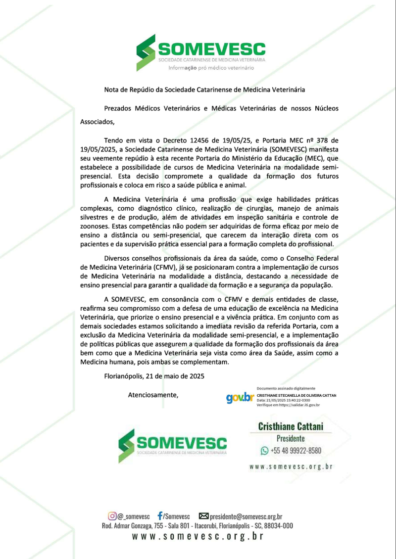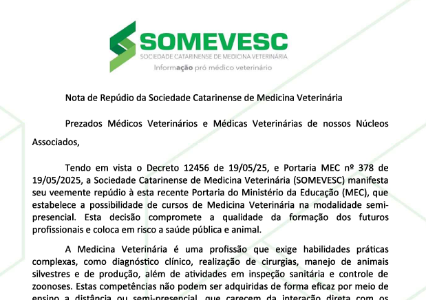Nossas Notícias Notícias Carta de repúdio a portaria do MEC que permite EAD na Medicina Veterinária 21/05/2025 Arquivos: Carta de Repúdio Compartilhar: Comentários